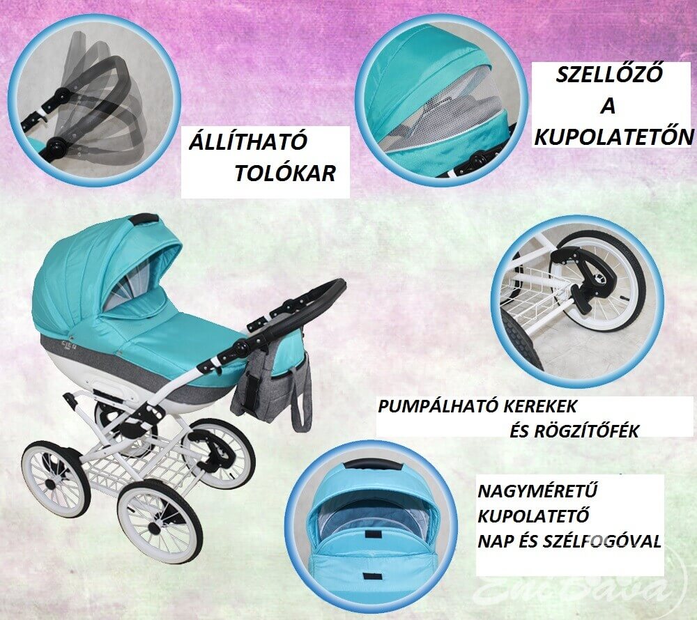 - A babakocsin jó felfüggesztés, ami biztosítja a kényelmes közlekedést, állítható rugózás.