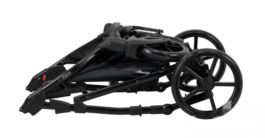 - Összecsukás után a kocsi kerekei és tengelyei leválaszthatók, így akár gardróbban is tárolható, vagy kis csomagtartóban szállítható a váz.
